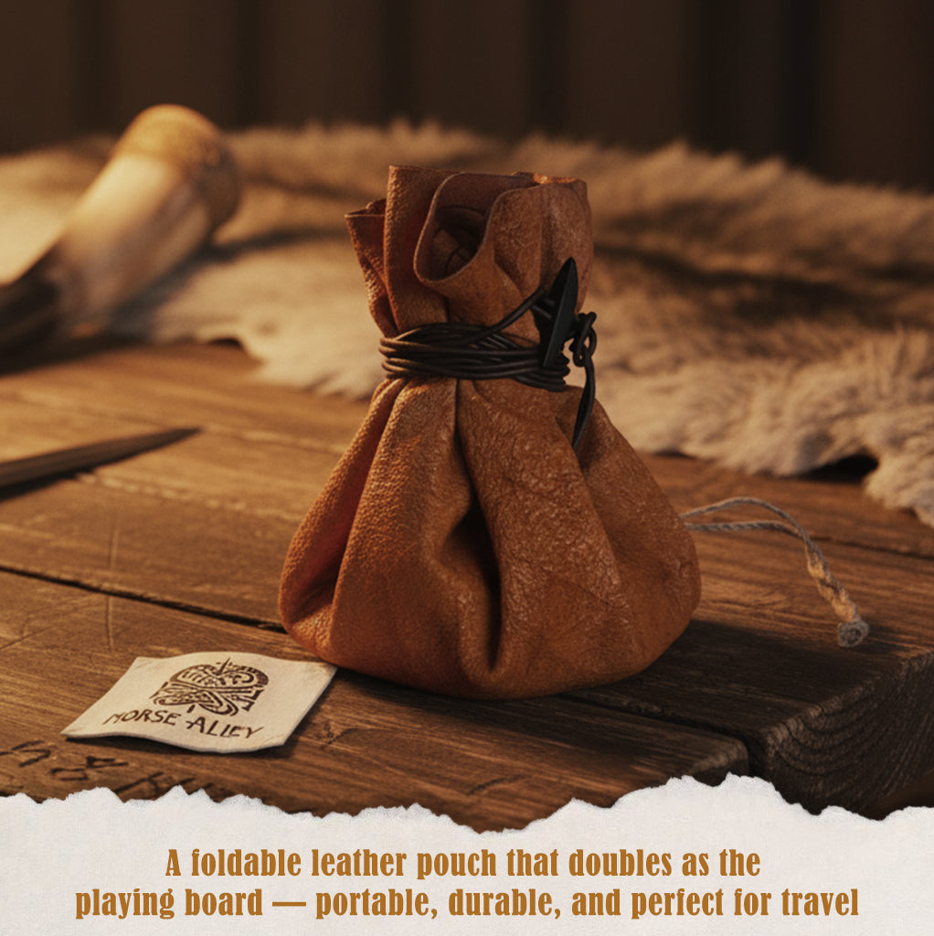 Our version comes complete with a foldable leather pouch which acts as a Hnefatafl board when fully opened.