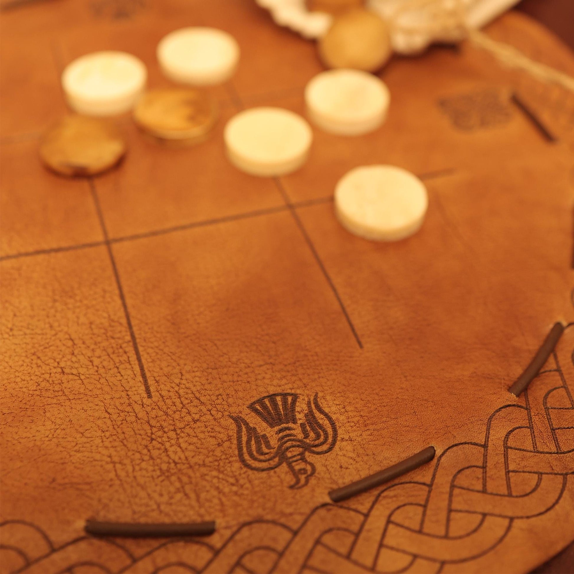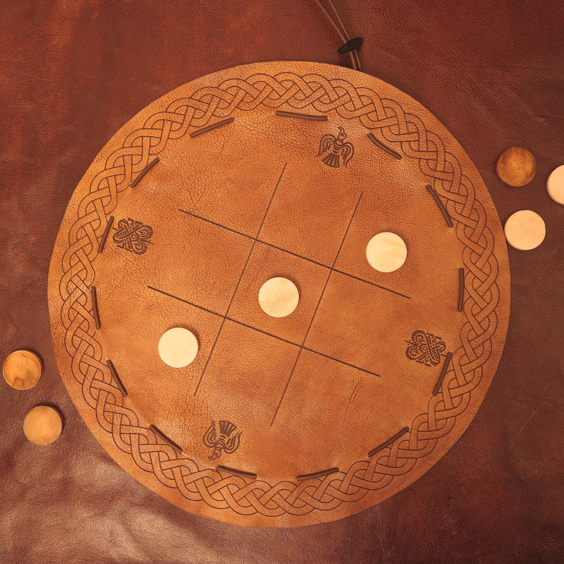 Viking Leather Tic Tac Toe Game – Handcrafted Multiplayer Board with Real Bone Pieces – Norse Travel Game for Adults & Gifting